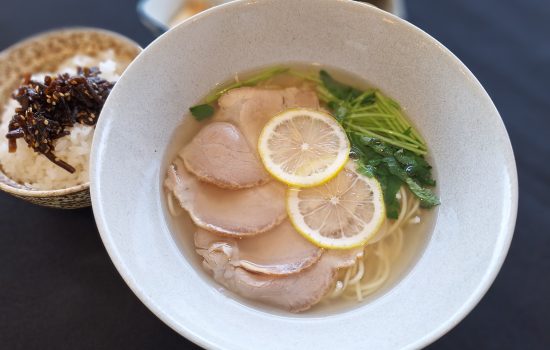 奈良CC特製の魚介スープにレモンを添えて さっぱりとしたラーメンです 是非一度お召し上がり下さい