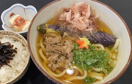 奈良CC特製出汁と秋茄子の素揚げ&甘辛く煮こんだ牛肉との相性抜群の「揚げ茄子肉うどん」です 是非一度 お召上がり下さい